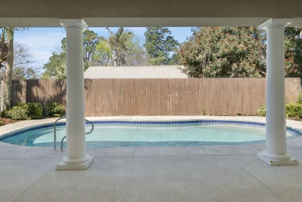 Step into one of the largest homes in highly desirable Palm Bay community that is positioned perfectly on a cul-de-sac in this single-level home with a private pool, 4 bedrooms, 3 full baths, home office, multiple living areas and an extended garage! This home has been well-maintained and offers over 2,800 square feet and is just 10 minutes from the World's Most Beautiful Beaches. As you step inside, you're greeted with 14 foot ceilings and a home office with glass French doors. A formal living room and dining room also feature soaring ceilings with incredible views of the private pool and covered patio. The family room, kitchen and breakfast dining area are just off the living room and are accessible to the pool and patio. The kitchen features solid wood cabinetry, center island and a large pantry. Ample counter space and a breakfast bar is great for entertaining and is open to the breakfast nook and family room. The family room features tons of natural light and built-ins with a fireplace. The three guest bedrooms and two guest baths are easily accessible from the family room while the split floor plan is highly desirable where the primary suite is located off the formal living room. The primary suite offers a tray ceiling, French doors to the patio, lots of natural light, dual walk-in closets, soaking tub, walk-in shower and dual vanities with solid wood cabinetry. The high ceilings in this single-level home are incredible! The quality construction paired with a 2-car garage is great at the beach and even better...an extended garage with roll-up garage door for golf cart, ice machine, toys and more!! In Palm Bay, you're just minutes from dining, shopping and entertaining on Panama City Beach. The Florida lifestyle is perfected with a private pool on a cul-de-sac homesite giving a spacious yard and privacy. Make Palm Bay your home today!